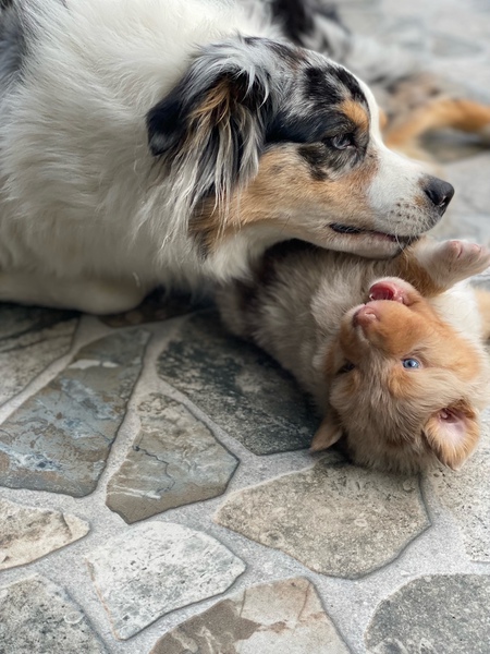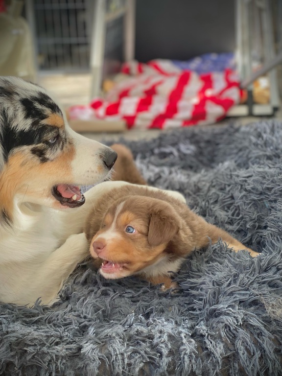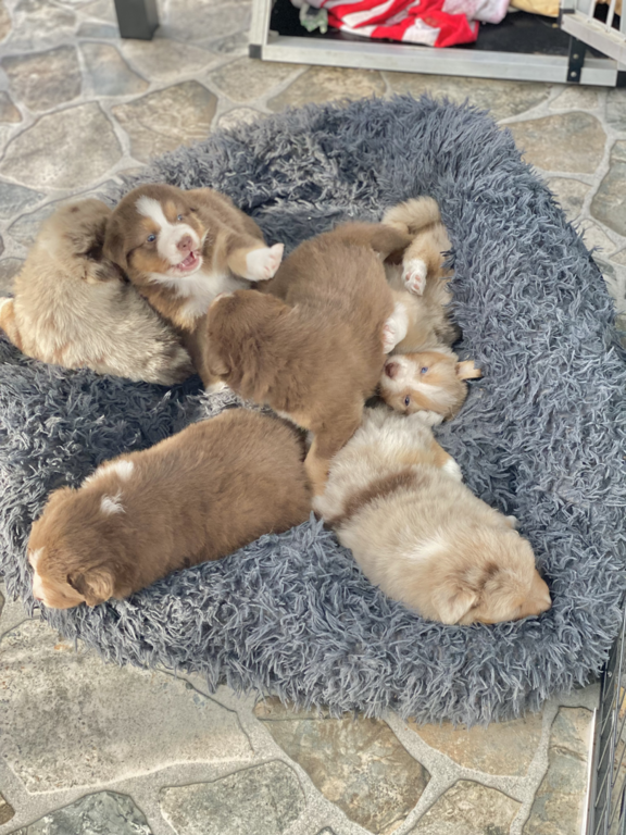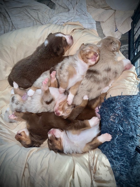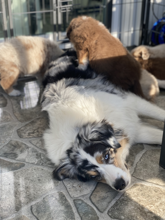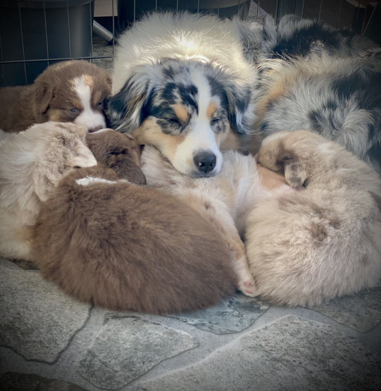 am Sonntag, den 02.10.2022 hat unsere liebe Sun 6 gesunde Australian Shepherd geboren. Weil wir 2020 so begeistert von der letzter Verpaarung waren, haben wir uns auch diesmal für den wunderschönen Bailey als Deckrüden entschieden.